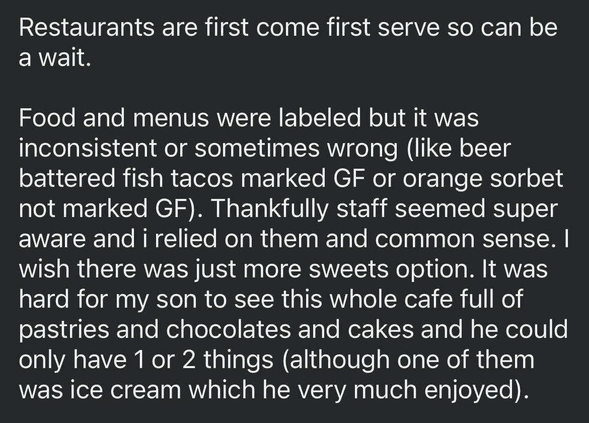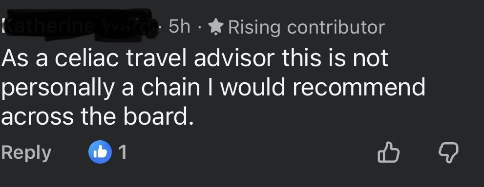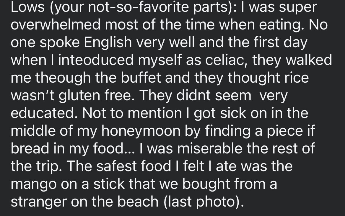 These are examples from a Facebook Travel Celiac/Allergy group with over 35,000 members.